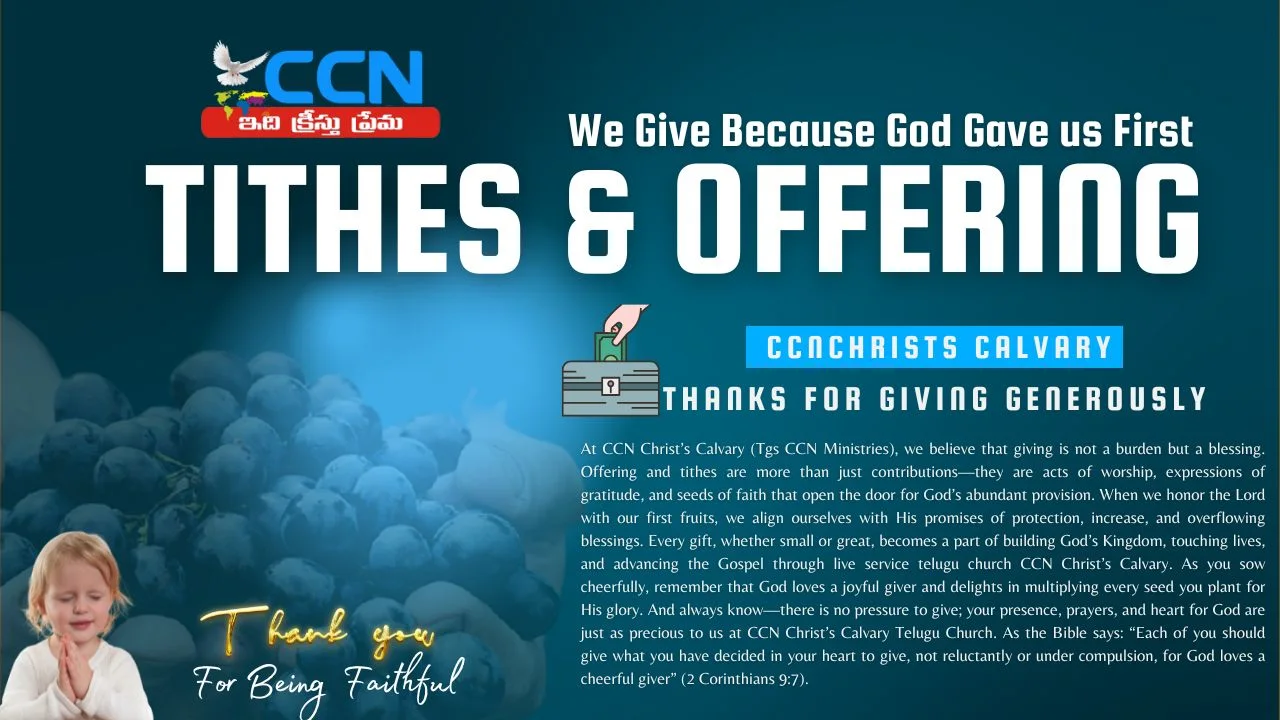 At CCN Christ’s Calvary (TGS CCN Ministries ), we believe that giving is not a burden but a blessing. Offering and tithes are more than just contributions—they are acts of worship, expressions of gratitude, and seeds of faith that open the door for God’s abundant provision. When we honor the Lord with our first fruits, we align ourselves with His promises of protection, increase, and overflowing blessings. Every gift, whether small or great, becomes a part of building God’s Kingdom, touching lives, and advancing the Gospel through live service telugu church CCN Christ’s Calvary. As you sow cheerfully, remember that God loves a joyful giver and delights in multiplying every seed you plant for His glory. And always know—there is no pressure to give; your presence, prayers, and heart for God are just as precious to us at CCN Christ’s Calvary Telugu Church. As the Bible says: “Each of you should give what you have decided in your heart to give, not reluctantly or under compulsion, for God loves a cheerful giver” (2 Corinthians 9:7).